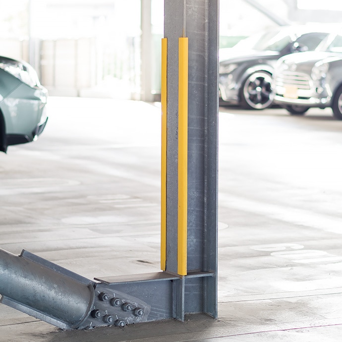 H鋼の端部をカバーする保護材です。耐震補強工事のH形鋼や鉄骨階段のガードとして。厚み9~13mm用。